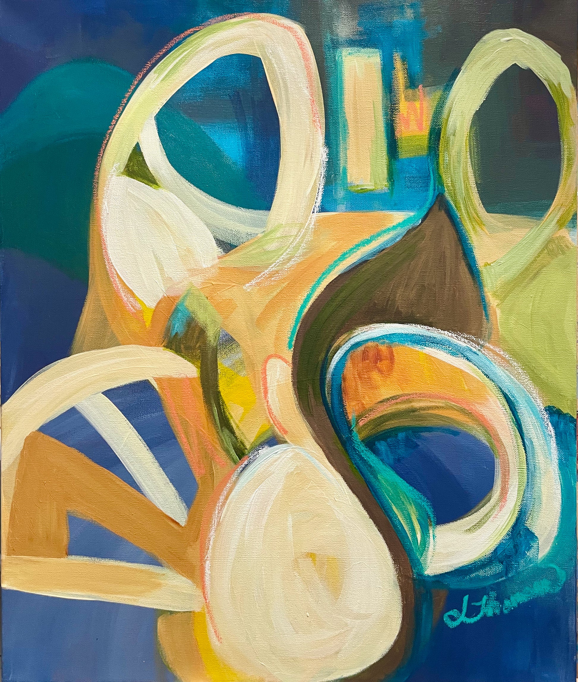 Painted in heavy body and fluid acrylics with resin crayon accents. Bold warm colors and shapes. Gallery wrapped canvas with the painting continuing around the sides means this painting is ready to hang on your walls! 24x30x1.75 inches.