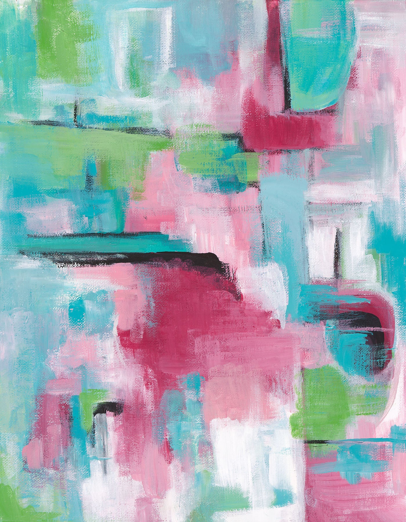 11 x 14 Canvas Panel mounted in a black floating frame. Soft pinks, magenta, blue, green, black and white abstract.