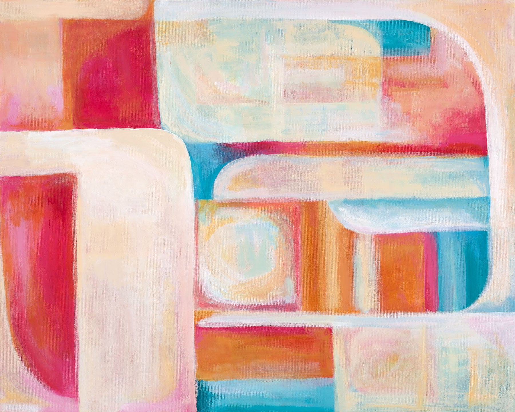 What started as an unruly and disorderly painting became a regimented, Mid Century Modern composition. A metaphor for life in a way - putting on that mask to be acceptable and presentable. Painted in fluid and heavy body acrylics on a 30x24 gallery wrapped canvas, the painting continues around the sides making a frame unnecessary for hanging. Painting is wired and ready to hang.