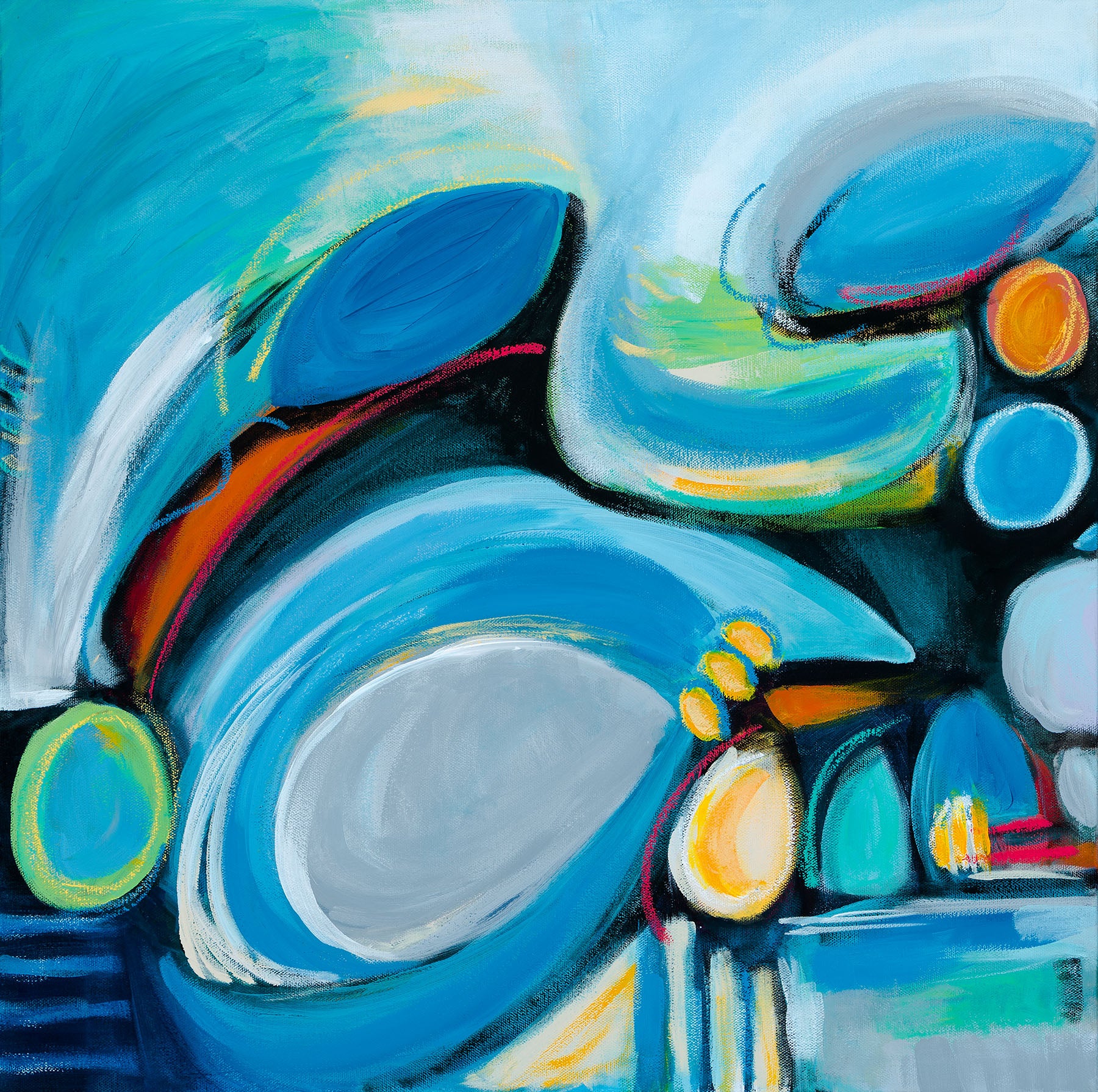 Heavy body, fluid, and acrylic paint pen on canvas in cool, fresh tones. Sweeping shapes suggesting the newness of Spring. Blues, orange, green, red, yellow, black and white. Organic shapes balanced by strict geometrics.