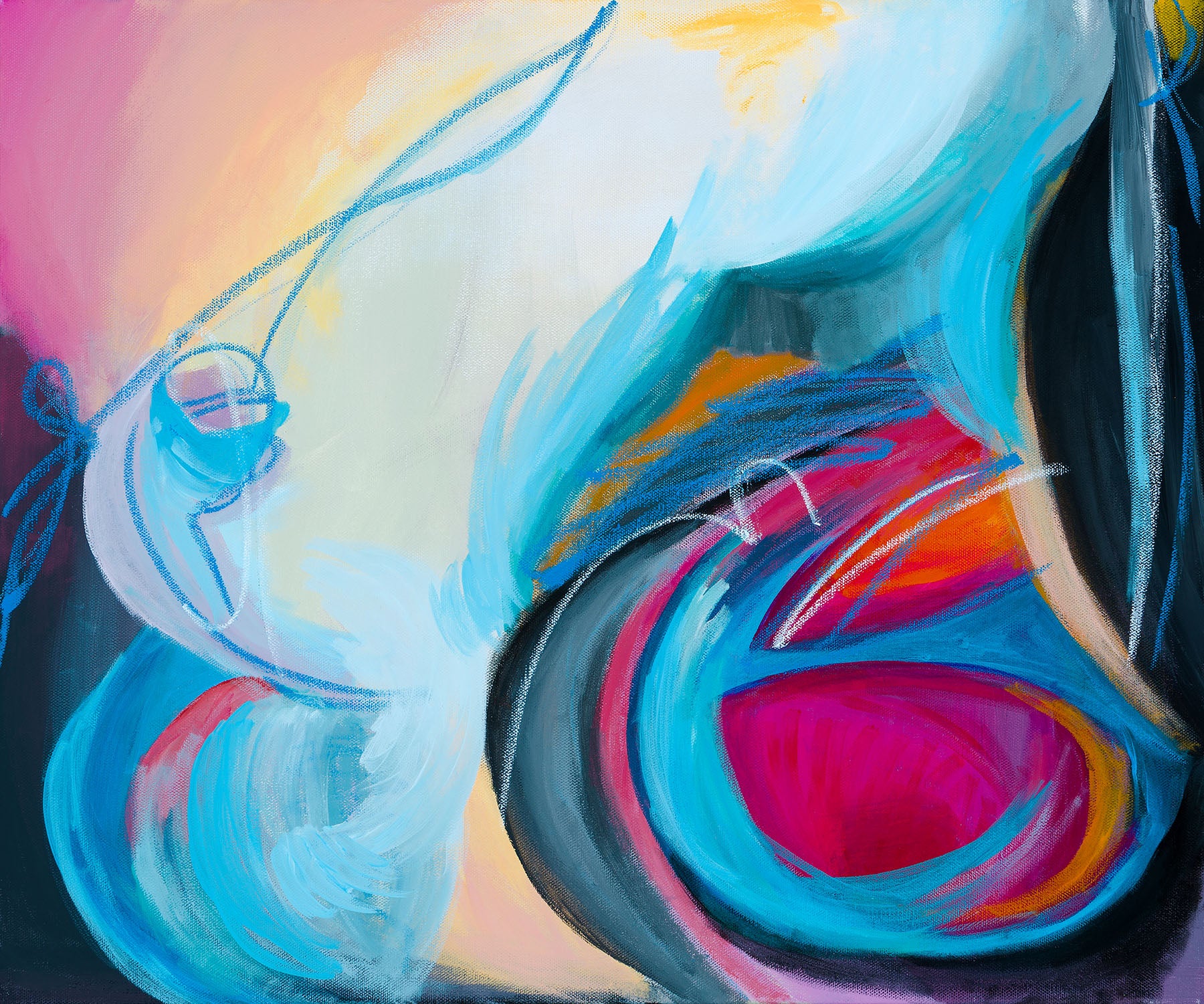 Painted in a combination of fluid, heavy body, and acrylic paint markers, Reverie captures the feeling of swirling and colliding thoughts and cotton candy skies.