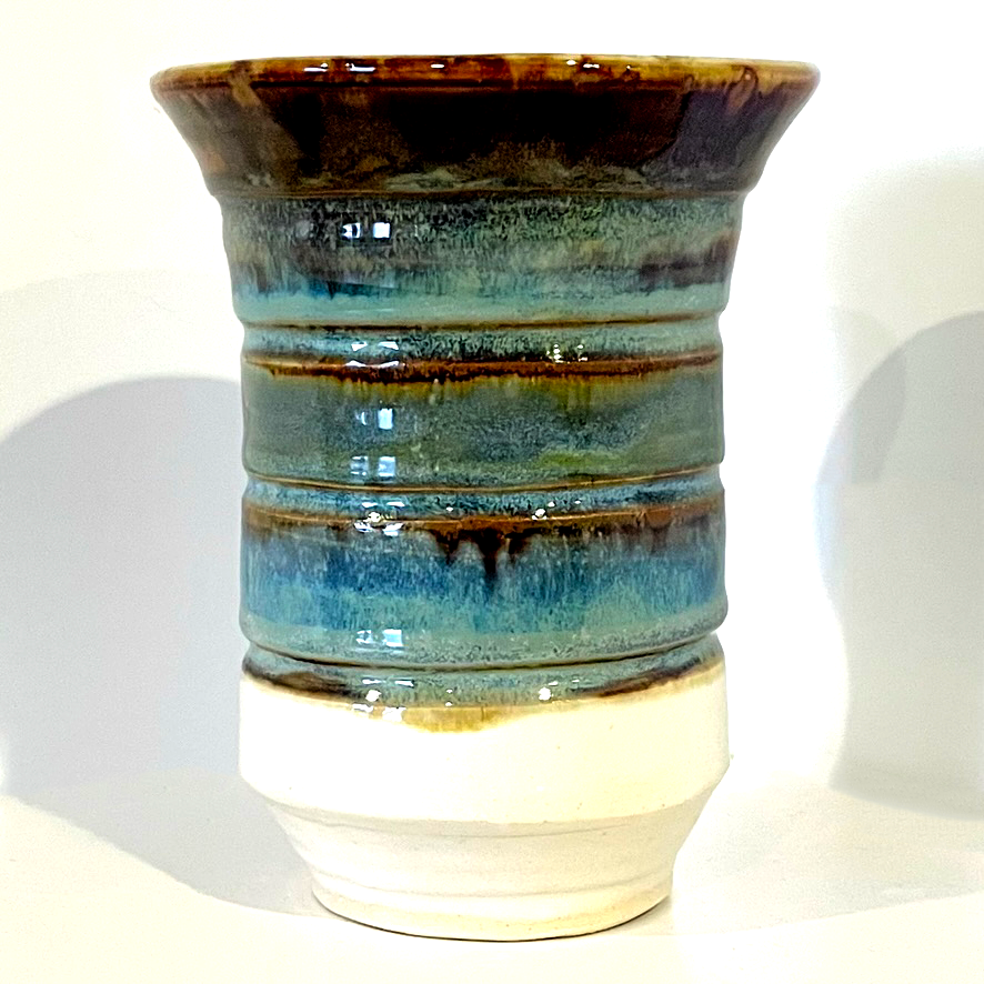 Lovely earthen browns melthing into tones of blue and green soften the geometric lines of this Stacked vase. Six inches tall, 3.5 inches round.