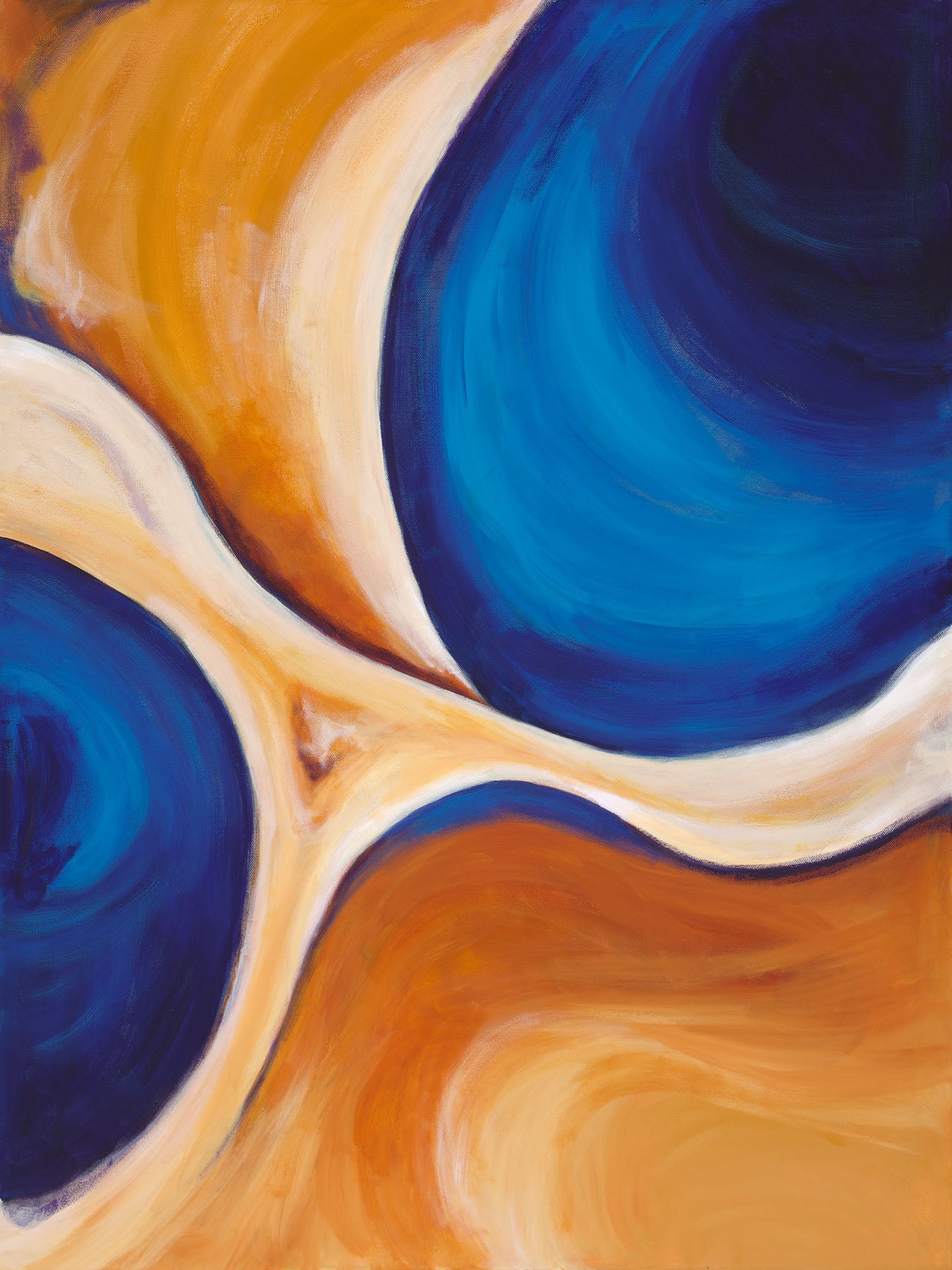 Large fields of color on a large scale with colors evoking seaside and waves. The buff and quinacridone nickel azo gold contrast with the deep blues and even touches of purple leading to the visual drama while still suggesting the peace and restfulness of a beachside retreat.